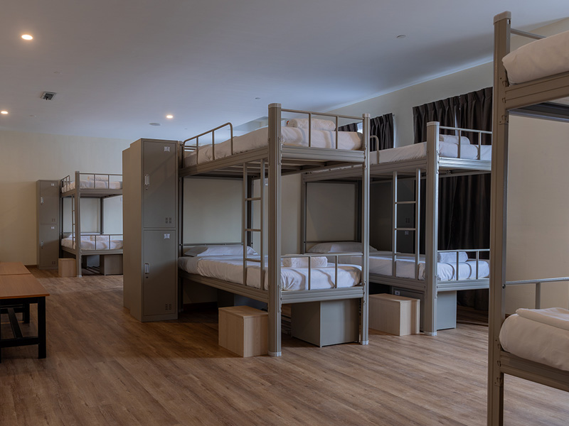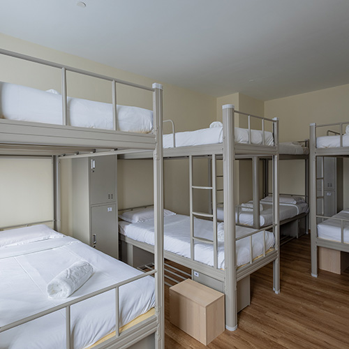 Our hostel features double-decker beds, accommodating 8-16 guests in a shared setting.